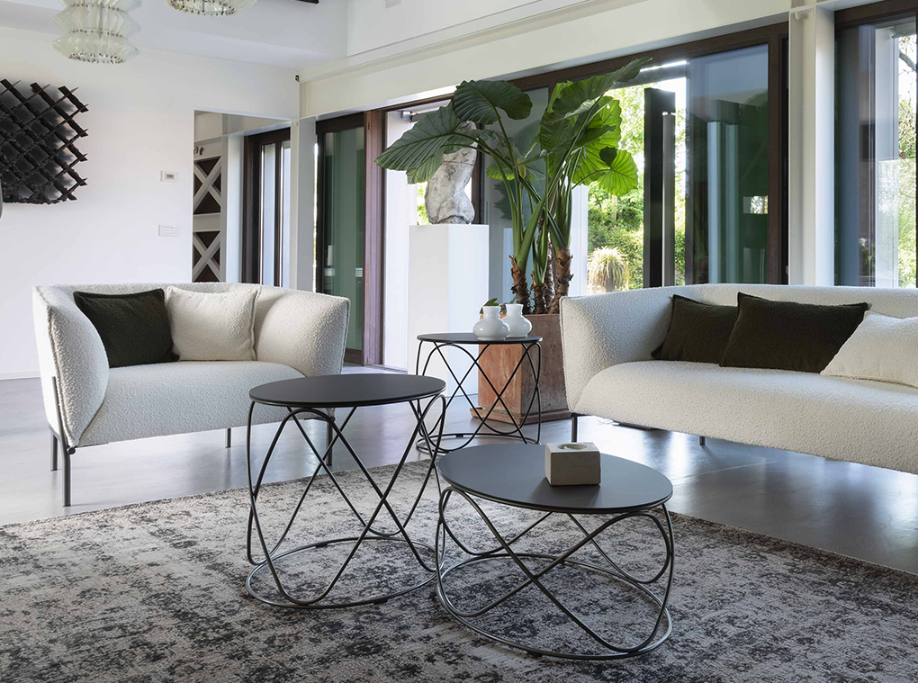 La struttura a vista in acciaio verniciato avvolge lo schienale del divanetto Aria, conferendogli un aspetto moderno e unico.