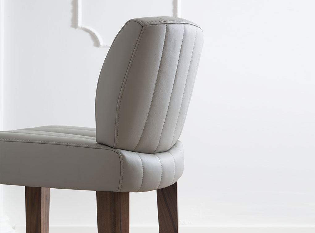 Struttura in legno massello tinta ad acqua con finitura poliuretanica. Sedile in compensato di faggio, poliuretano espanso rivestito in tessuto o pelle.