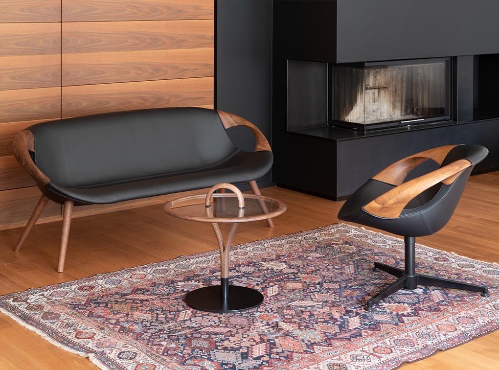 L’originale forma di Up viene mantenuta anche per il divano, ultima novità della collezione. I braccioli, realizzati in pregiato legno di noce canaletto oppure rovere, vengono ulteriormente valorizzati accostandoli alla morbida pelle che riveste l’intera seduta.
