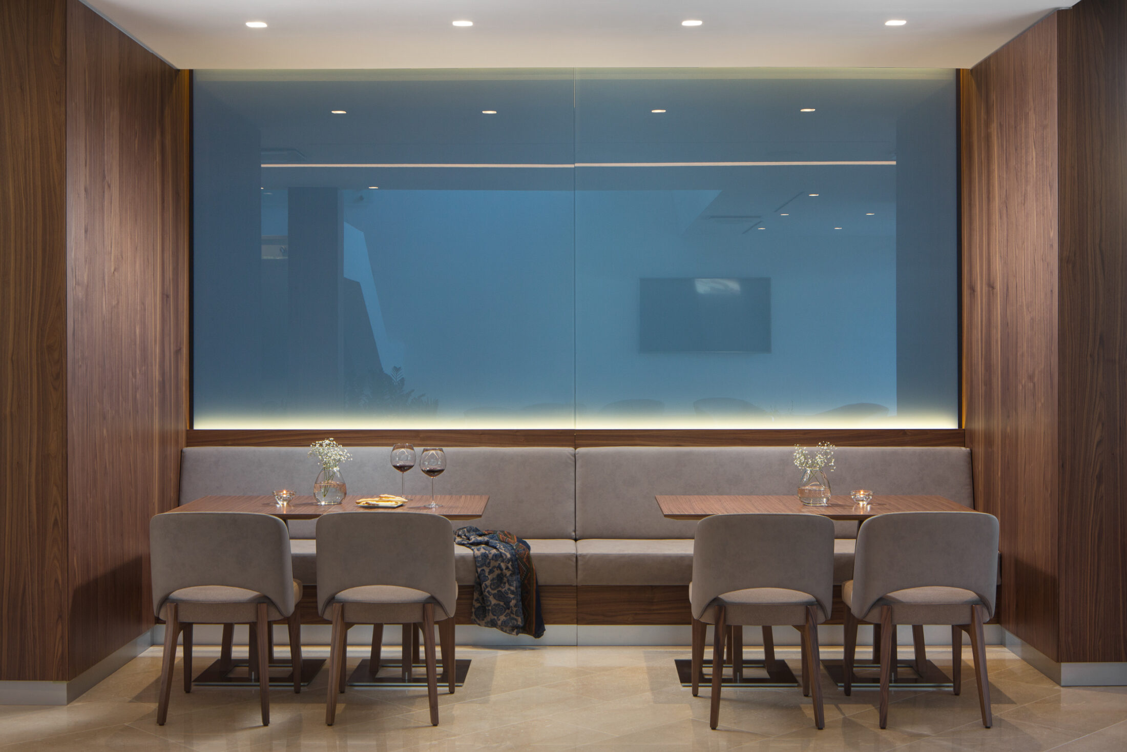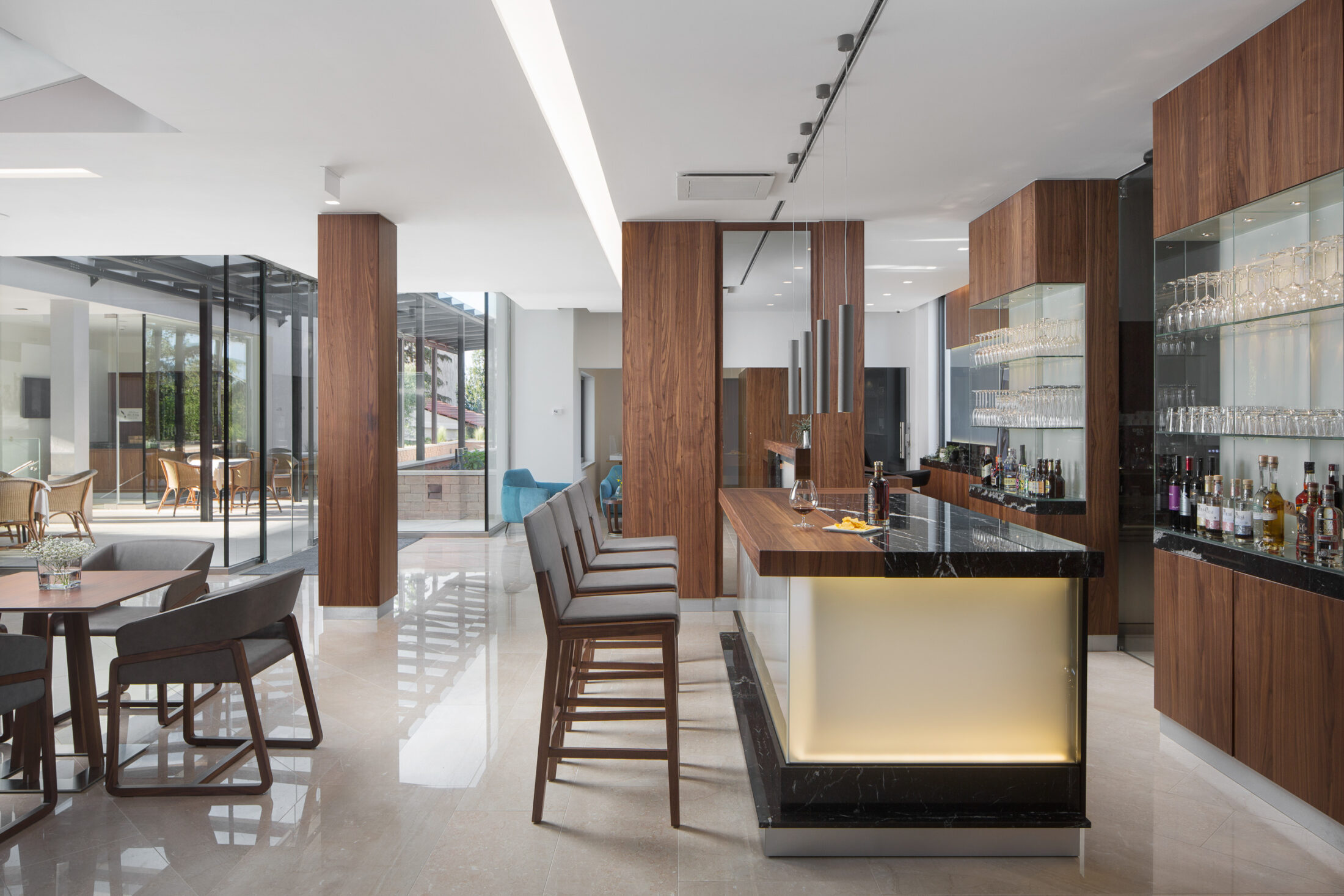 Per il piano bar sono stati scelti lo sgabello Euthalia, la sedia Chic e i tavolini Sella. Tutti questi complementi d’arredo hanno forme rigorose e sobrie. La massiccia presenza del legno di noce canaletto conferisce all’ambiente calore ed eleganza. Per le camere, la zona relax è stata arredata con le poltroncine Libra e con il tavolo Salt&pepper. Un’ultima chicca, il tavolino Diamond, dalle forme che richiamano la struttura di un diamante. Infine, per il ristorante vengono riproposti la collezione Libra, stavolta con le sedie, e i tavoli Sella.